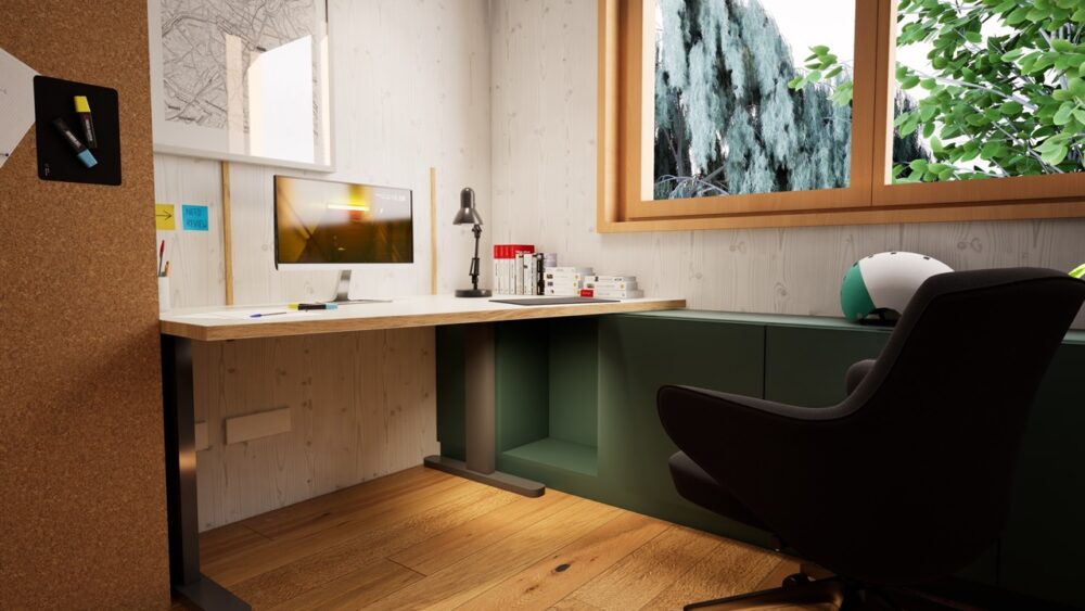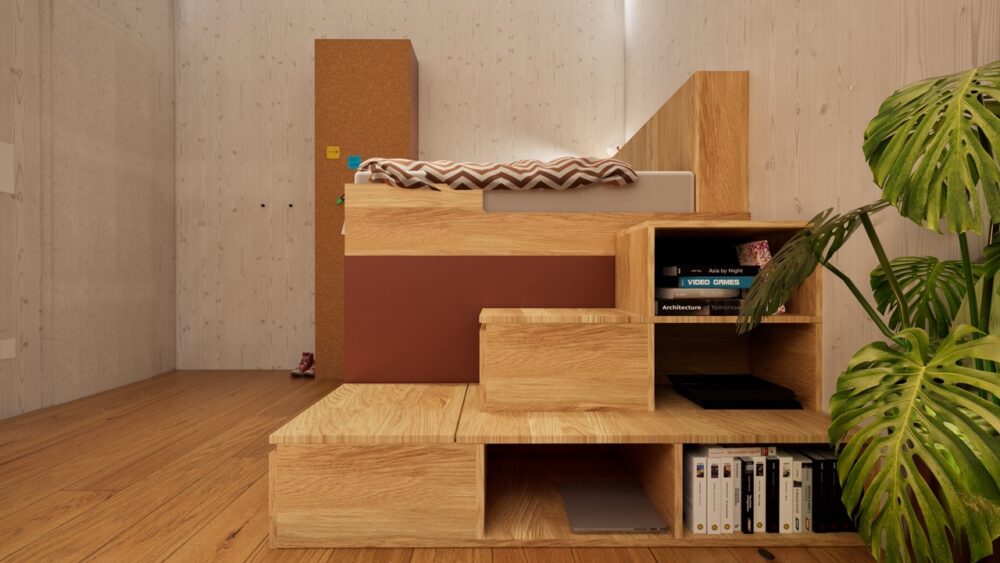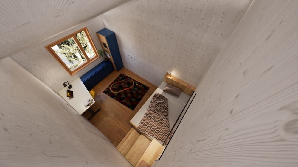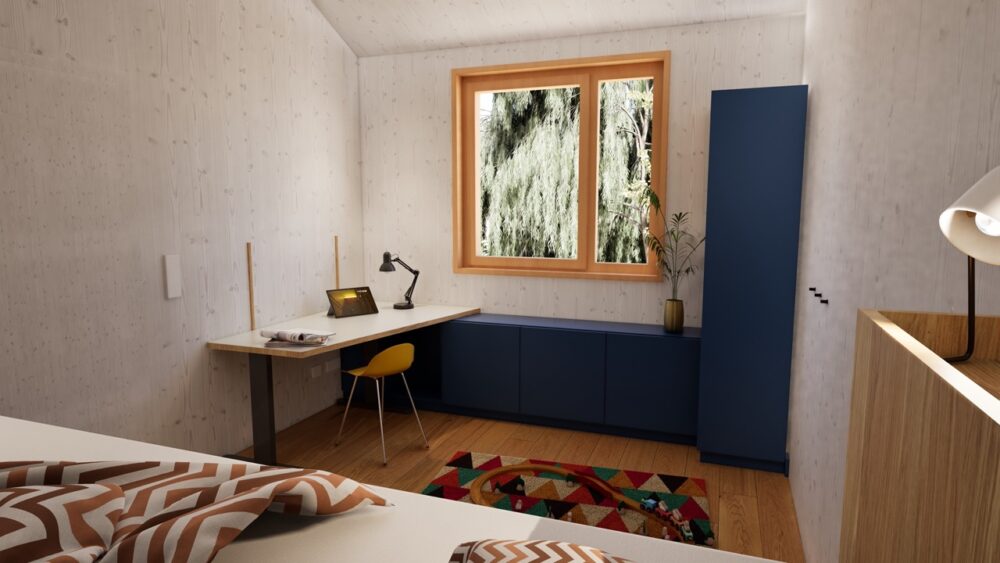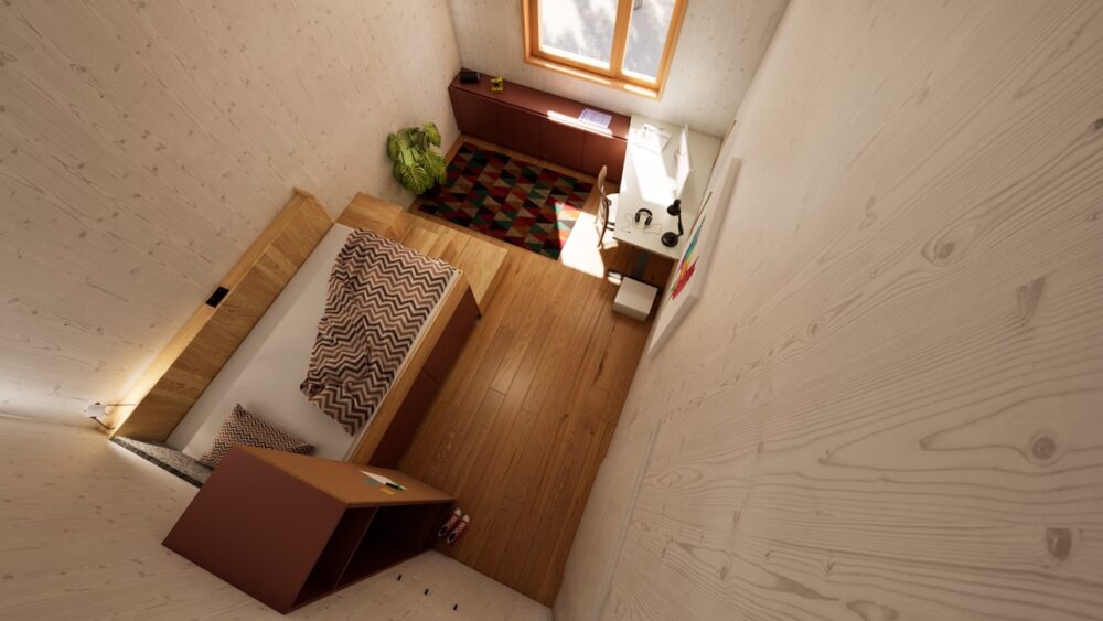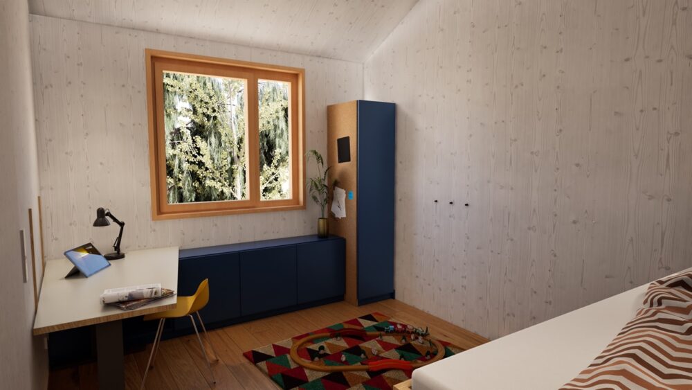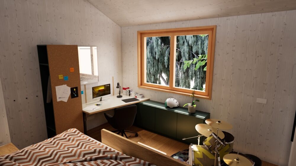 Für eine Familie mit drei Kindern wurde die Aufgabe formuliert, drei Jugendzimmer so zu entwickeln, dass sich kein Kind benachteiligt fühlt. Gleichzeitig war es wesentlich, Synergien in Planung und Fertigung zu nutzen, um den Preis pro Zimmer wirtschaftlich zu halten.