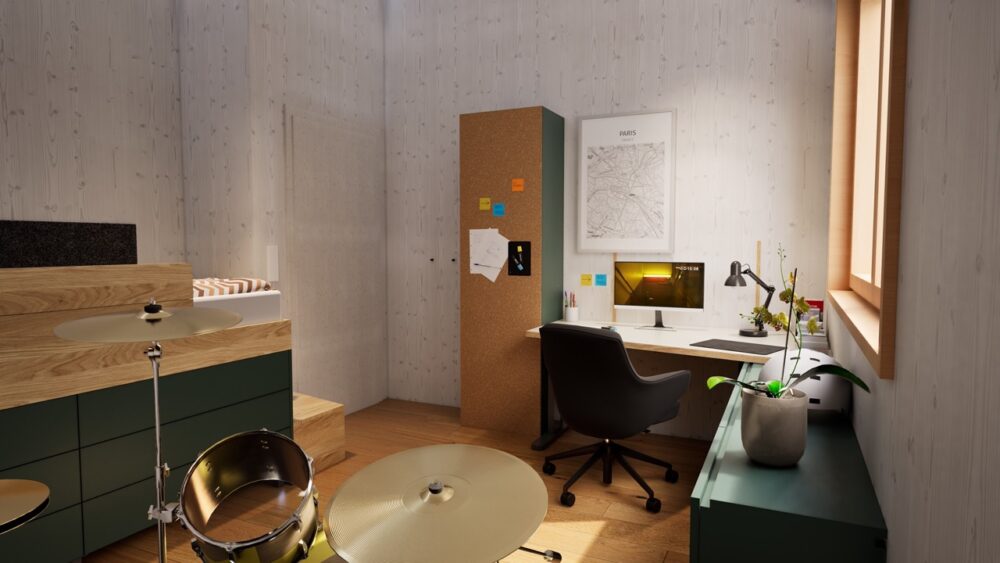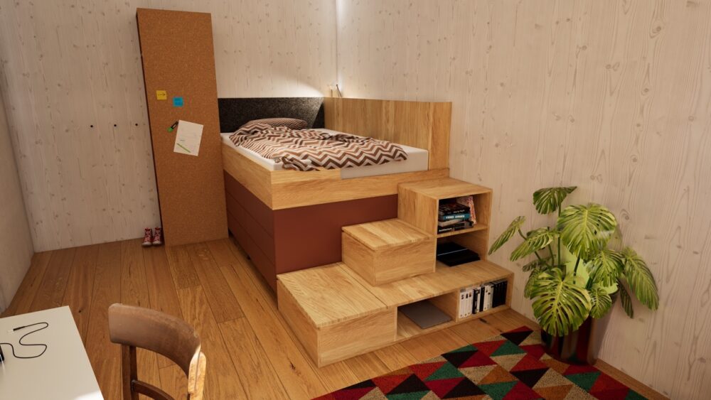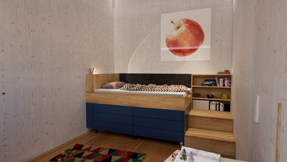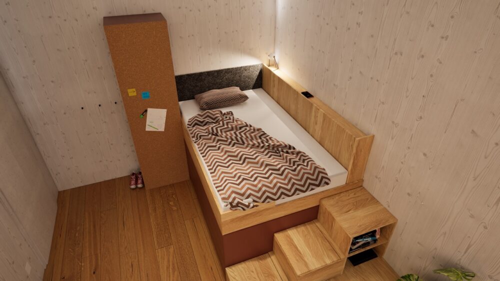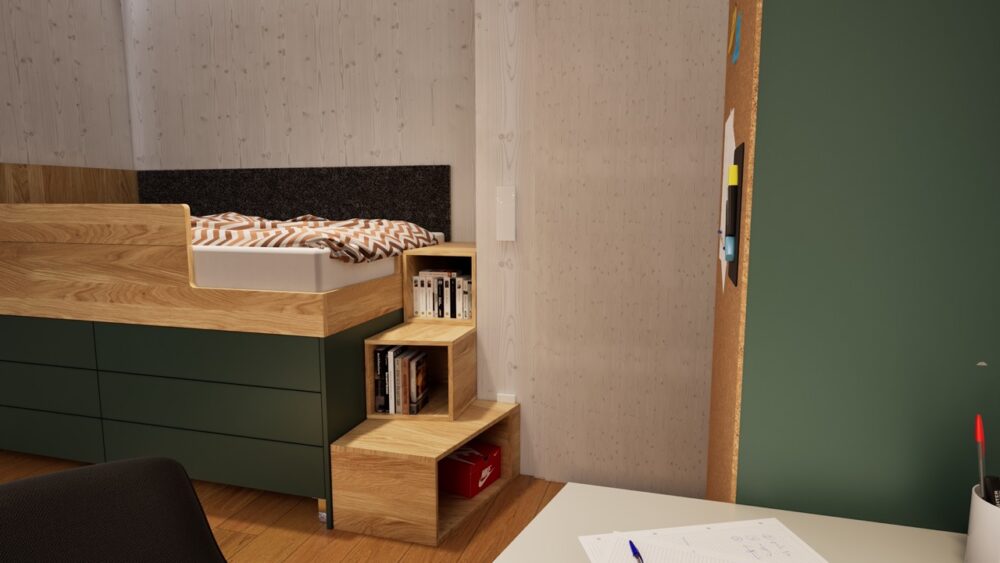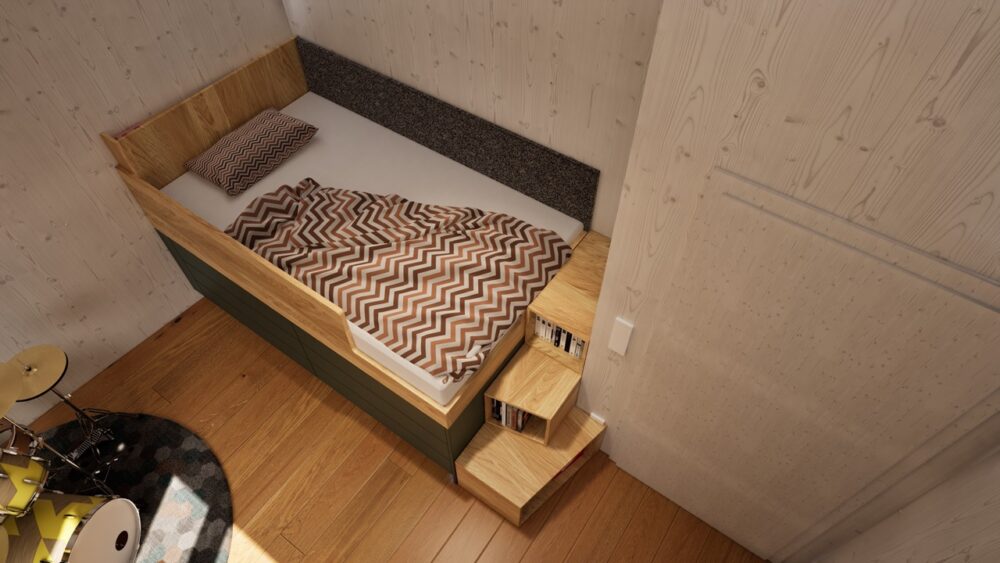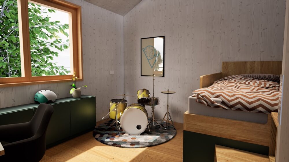 Ein zentrales Element sind die von uns häufig eingesetzten Kastenbetten. Durch diese Bauweise entsteht integrierter Stauraum unter dem Bett: Großzügige, rund 80 cm tiefe Laden bieten außergewöhnlich viel Platz und ersetzen klassische Kleiderschränke. Dadurch benötigt jedes Zimmer lediglich einen kompakten Hängeschrank. Ergänzt wird das Konzept durch höhenverstellbare Schreibtische, Sideboards für Schulsachen sowie integrierte Treppen als Zugang zum Bett. Trotz der kompakten Raumgröße bleibt ausreichend Platz für individuelle Nutzungen – in diesem Fall sogar für ein Schlagzeug.